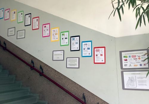 Begleitend zum Unterricht wurde das Treppenhaus im Altbau über drei Stockwerke hinweg als umfassende Informationswand gestaltet. Diese führt thematisch von der Frage „Warum wählen?“ über das Wahlsystem und die Aufgaben des Landtags zur Vorstellung der Parteien. Darüber hinaus werden die Wahlkreiskandidierenden mit realistischen Chancen auf den Einzug in den Landtag präsentiert. Ergänzt wird die Infowand durch Schwerpunktanalysen ausgewählter Wahlprogramme, die den Schülerinnen und Schülern einen vertieften Einblick in politische Positionen ermöglichen.